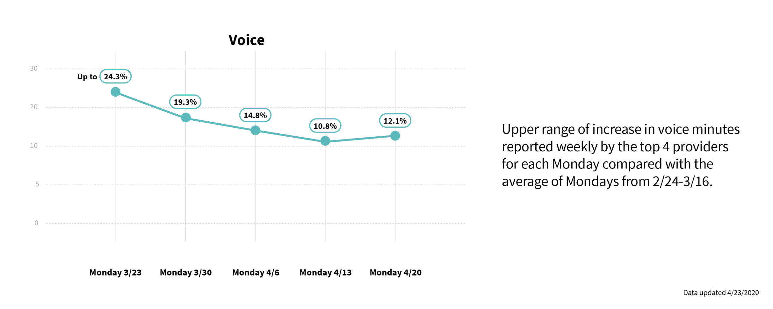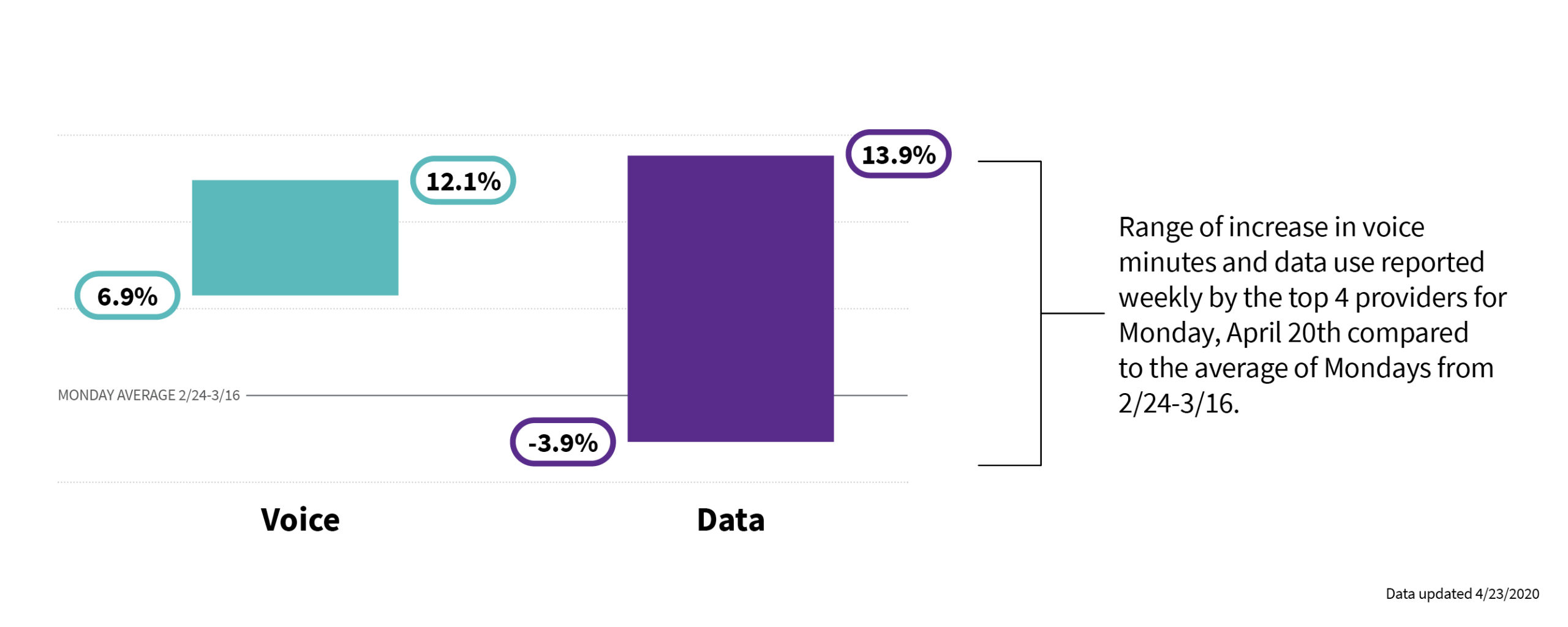 To provide insight into how these networks are performing, CTIA is now reporting changes in voice and data traffic on a weekly basis. This information draws on the work of engineers at AT&T, T-Mobile, U.S. Cellular and Verizon who are closely monitoring their networks and making adjustments to address shifting demand.